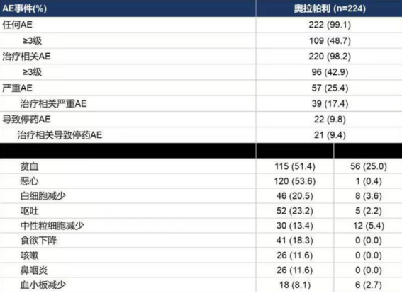 从安全性结果来看,L-MOCA较之以往的研究并没有出现新的安全性信号。在L-MOCA研究中仅有9.4%的患者因为治疗相关不良事件(AE)终止了治疗,最常见的AE依次是贫血、恶心、呕吐。其中三级以上AE的发生率也较低,这与既往欧美人群为主的全球多中心研究安全性数据一致,再次验证了奥拉帕利血液学安全性良好,治疗中减量和停药比例少。