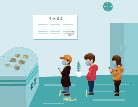 单位食堂就餐严格遵守秩序,不扎堆、不攀谈,排队打饭、同向就餐,始终牢记保持一米以上的社交距离。在家就餐提倡“餐具专用、合理分餐、使用公筷”,用“小文明”推动“大健康”。