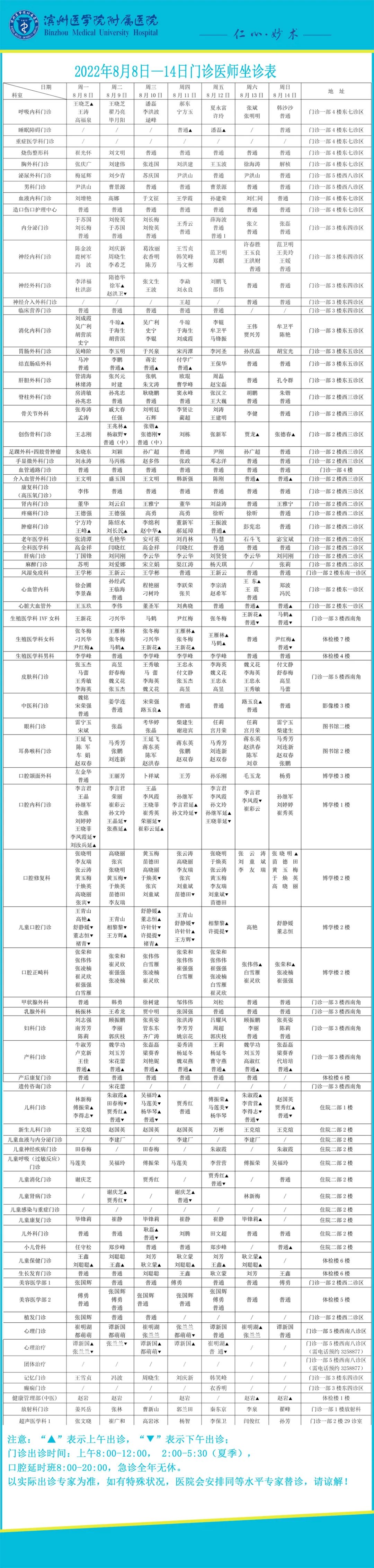 滨医附院2022年8月8日—14日门诊医师坐诊表!
