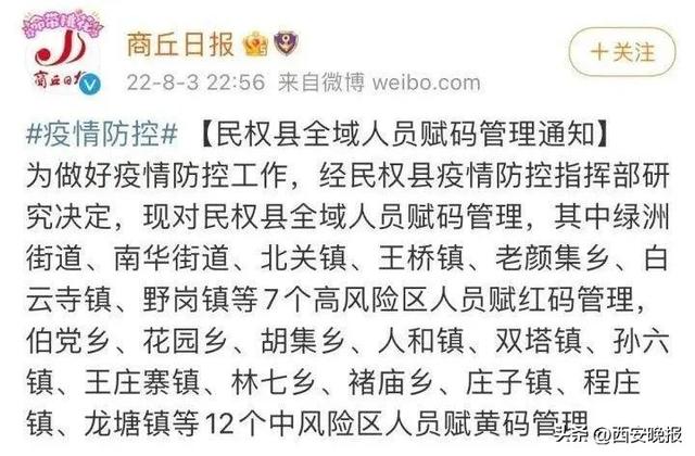 8月3日晚间,商丘市民权县发出“全域人员赋码管理通知”,决定对全域人员赋码管理,其中绿洲街道、南华街道、北关镇、王桥镇、老颜集乡、白云寺镇、野岗镇等7个高风险区人员赋红码管理,伯党乡、花园乡、胡集乡、人和镇、双塔镇、孙六镇、王庄寨镇、林七乡、褚庙乡、庄子镇、程庄镇、龙塘镇等12个中风险区人员赋黄码管理。