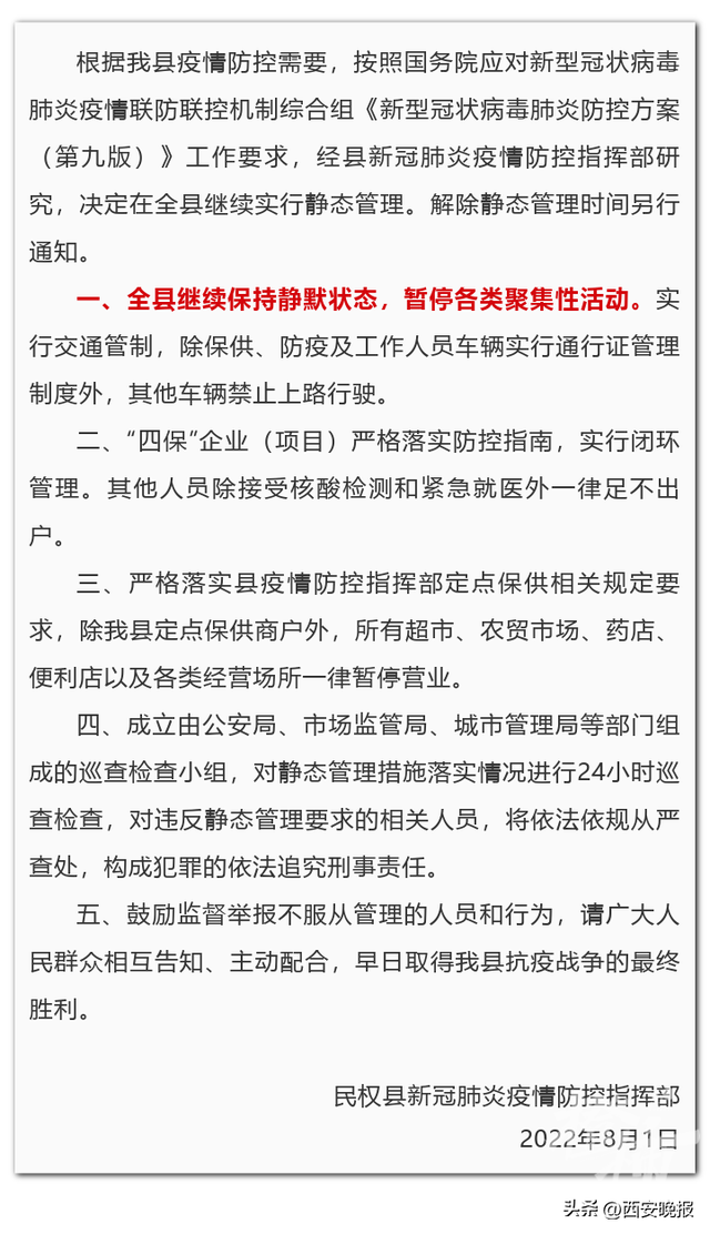 民权县8月1日新增54例,8月2日新增41例。在静态管理的第7天,民权县再发通告:全县继续保持静默。