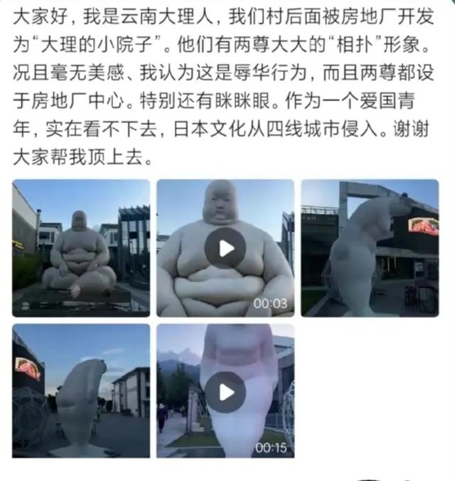 近日,云南大理“左岸高地”文旅街区两座“肥胖者”雕塑被误认为是日本相扑运动员,网友称有辱华和文化入侵嫌疑。该街区回应称是私人艺术藏品,与日本无关,已配合调查。