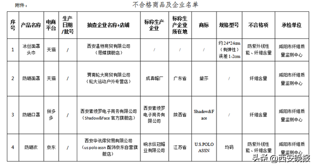 对我省辖区销售防晒纺织品的网络交易经营者,共抽查商品20批次,涉及天猫、京东、拼多多、苏宁易购等4家电子商务平台,发现不合格商品4批次。重点对防晒纺织品的纤维含量、甲醛含量、ph值、耐水色牢度、耐汗渍色牢度、耐干摩擦色牢度、防紫外线性能等7个项目开展检验。不合格项目涉及纤维含量、防紫外线性能。