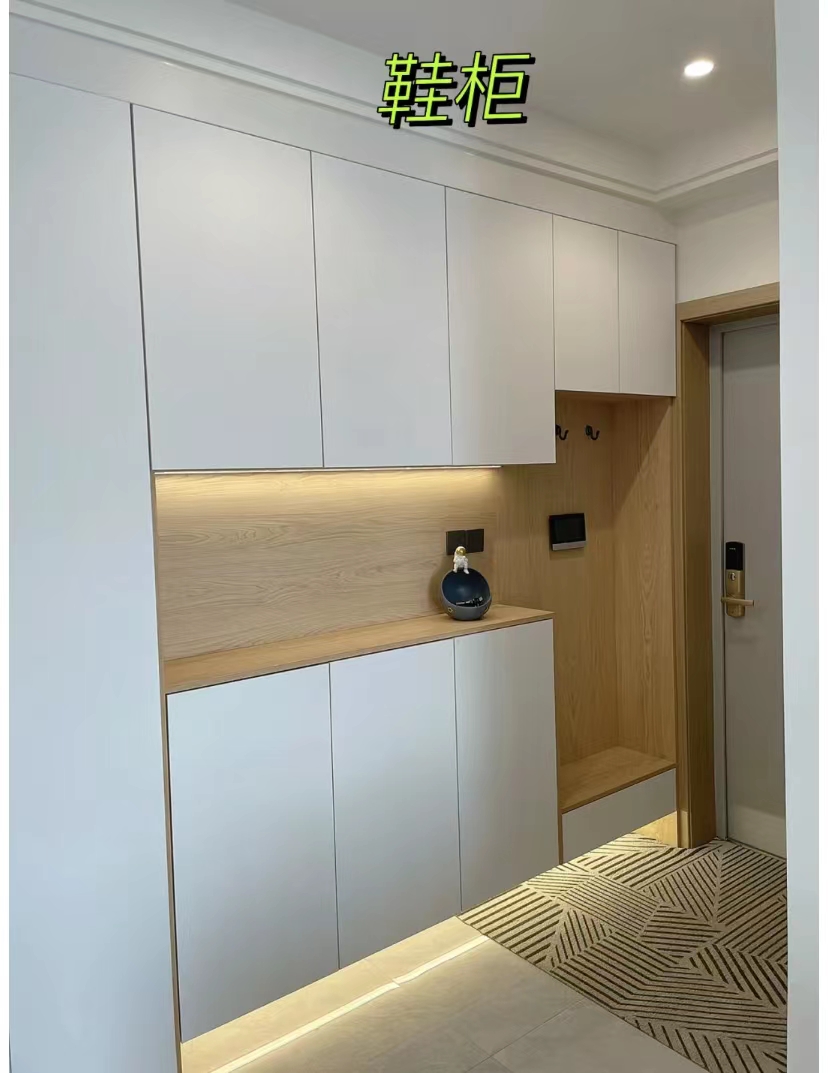 整面墙的柜子,收纳能力非常的大,不仅可以收纳一家人的鞋子,还能收纳一些日常的用品和杂物等,将所有的东西都收纳到柜子里,可以让门厅更加整洁。