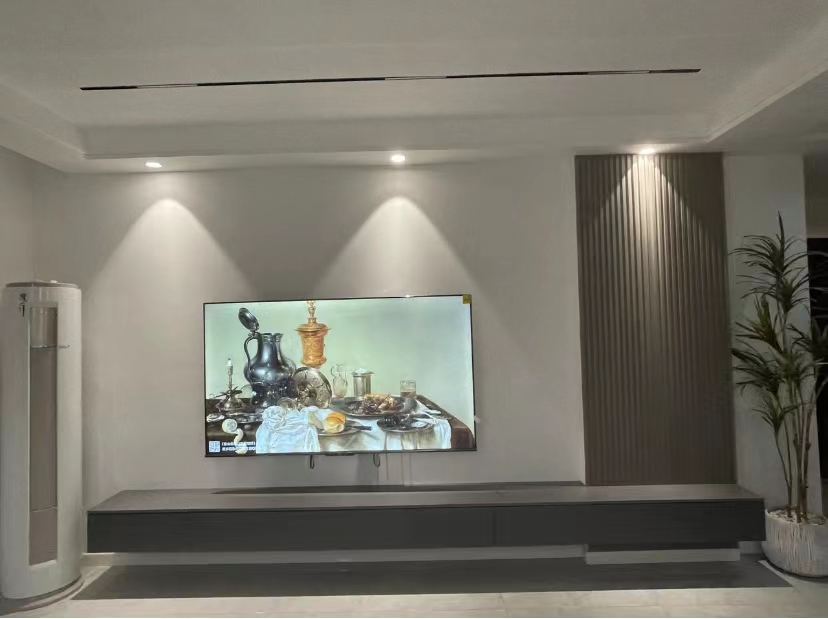 电视背景墙非常简单,白色乳胶漆+格栅+悬空电视柜,在这里强调一下这三个的施工顺序,1、刷乳胶漆2、安装悬空电视柜3、最后安装格栅。