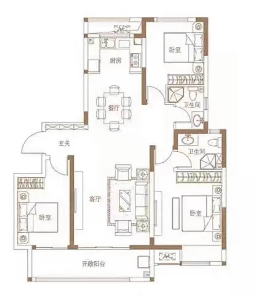 建筑面积120㎡,套内94㎡,三室两厅两卫一厨,客餐厅一体,南北通透的户型,常住人口是小两口。