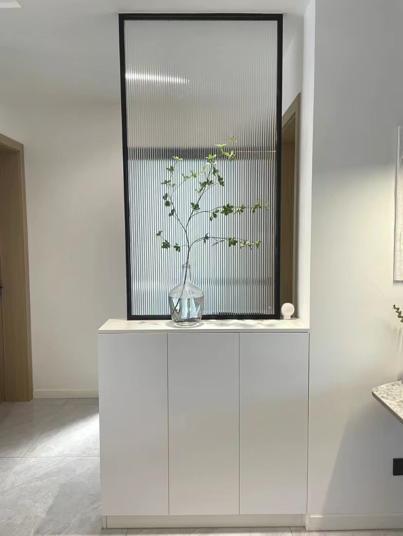 这是离玄关还有一段距离的过道尽头的位置,因为一进门就能看见,所以把它归纳到了玄关空间来介绍。这是一个下部是矮柜,上部是长虹玻璃的隔断,柜子可用于收纳,长虹玻璃透光不透人,明亮又满足隐私性。