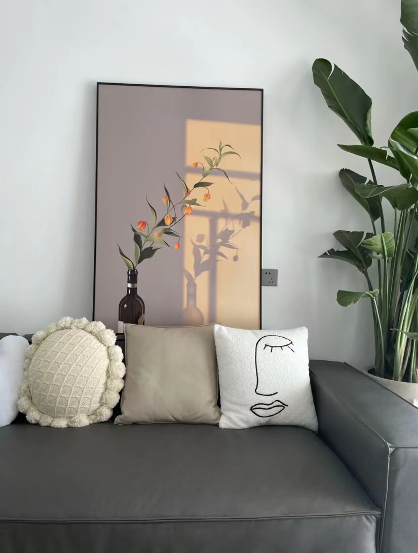 沙发后面的装饰画,很有立体感,看起来像由一幅素色的背板、一支小花、一个红酒瓶和一束夕阳组合而成的,很有意思。