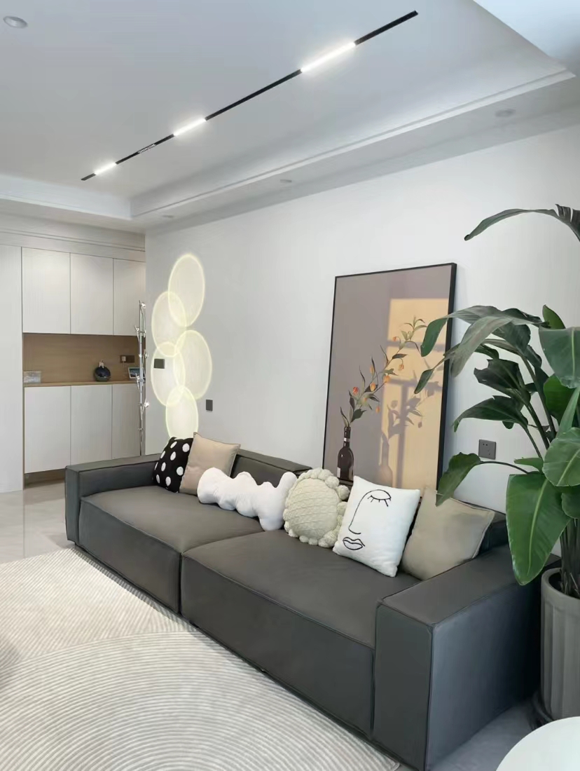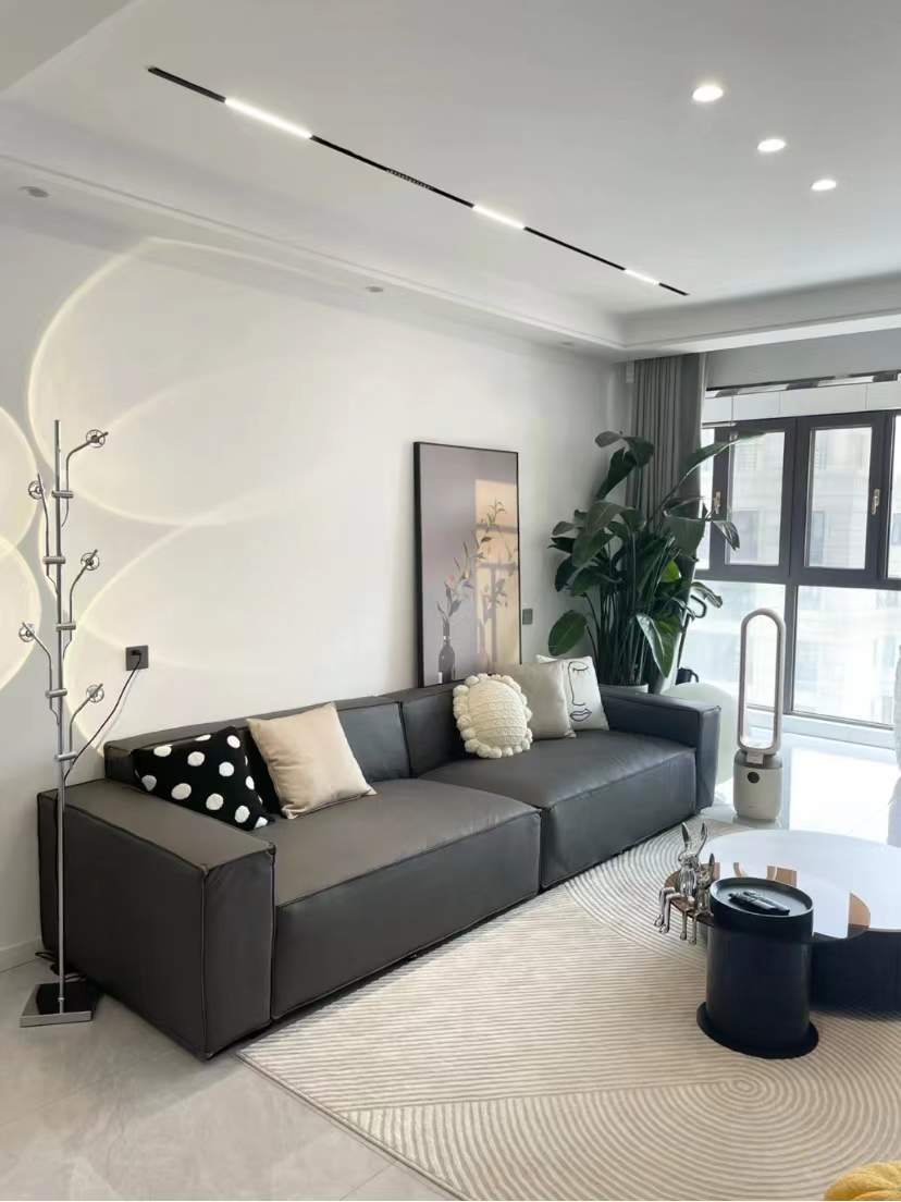 沙发是3.2m直排豆腐块沙发,没有贵妃椅,让客厅更显大。沙发表面用的是黑色的科技布,看起来很高级,关键是价格也不贵。