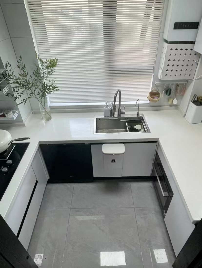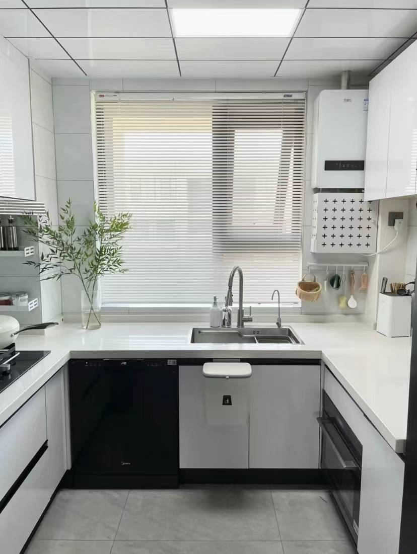 厨房设计的是u型的,台面高度8cm,按照洗-切-炒的顺序分为水槽区-备菜区-烹饪区真的是越用越顺手。