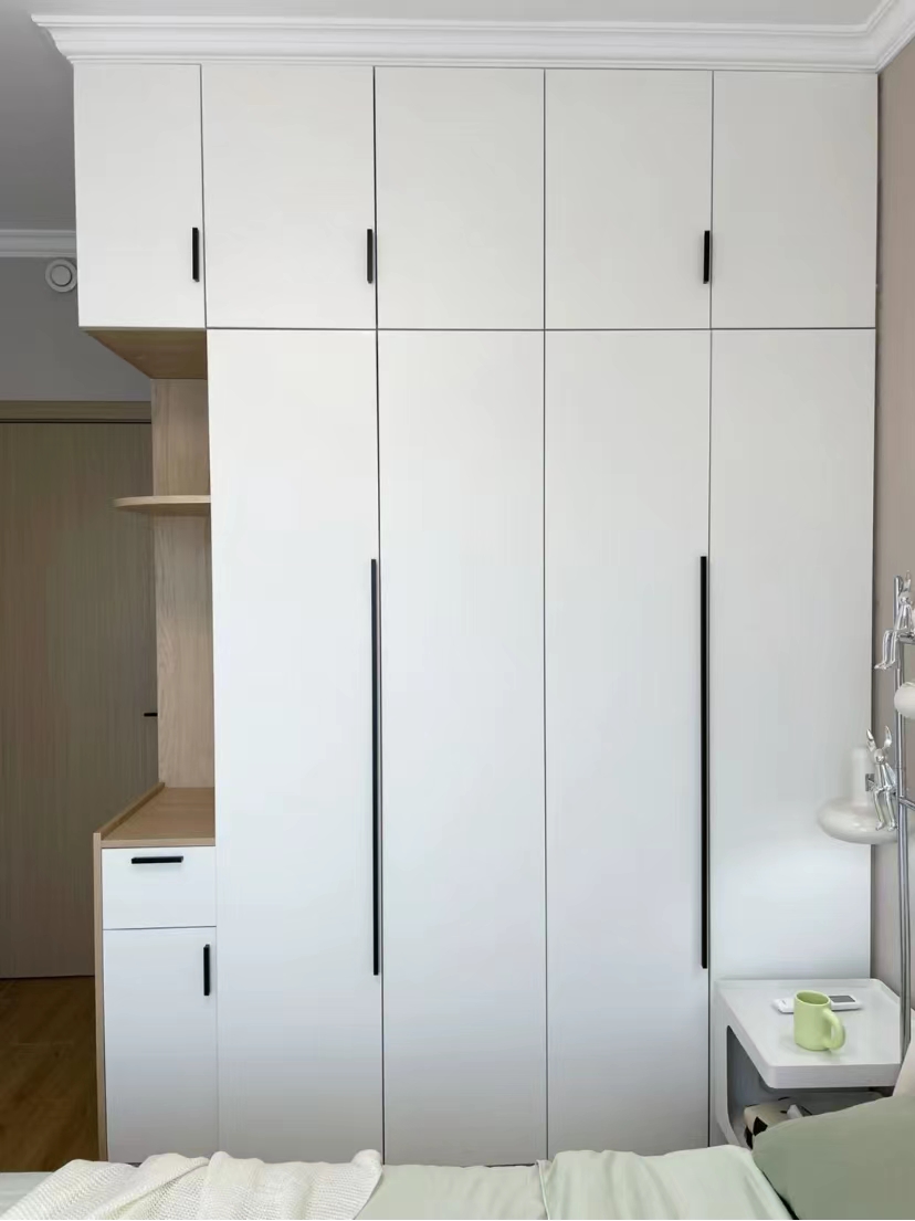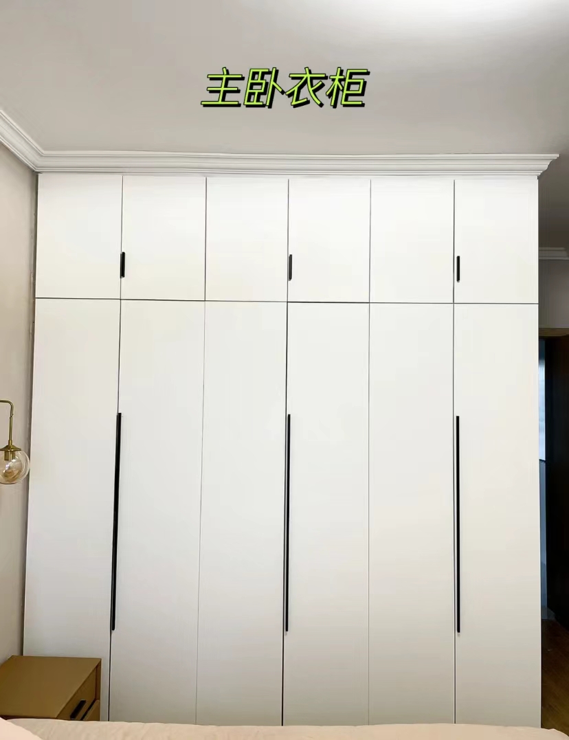 侧墙的柜子还是要做满的,全部用于收纳,可以装很多的东西,不管是衣物还是床上用品,都能通通装起来。