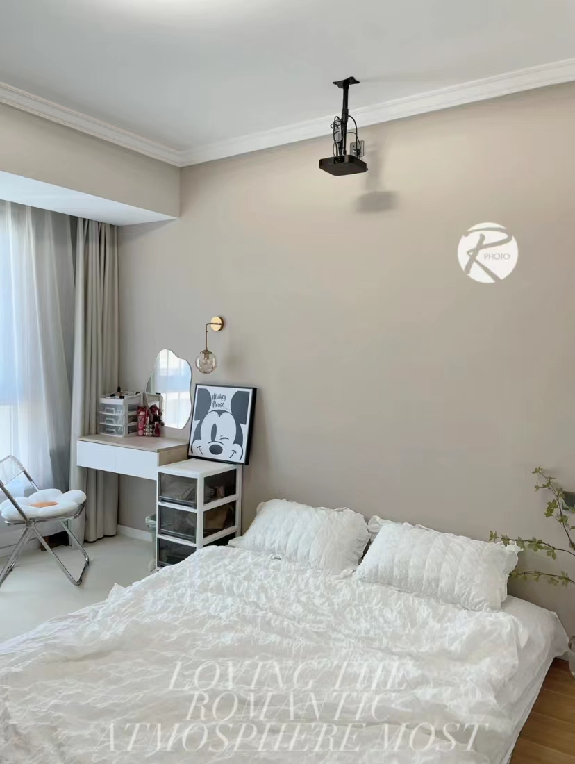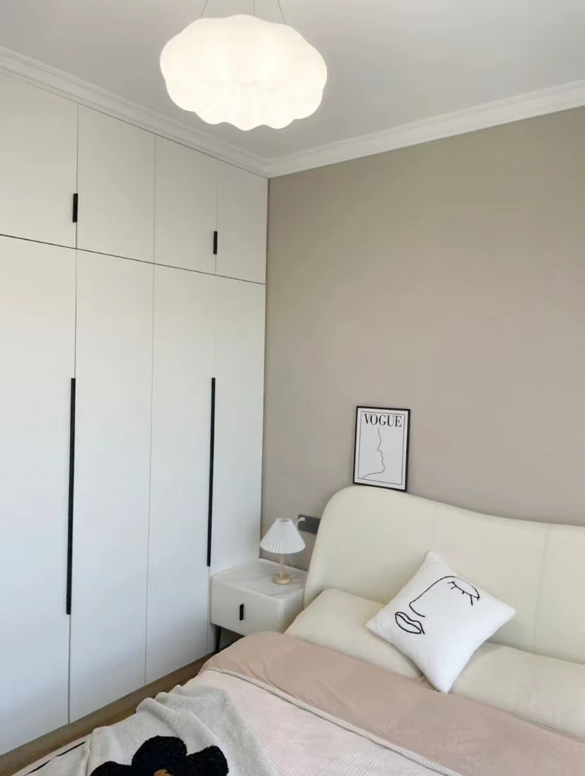 全屋通刷乳胶漆,床头背景色是布莱肯棕,其他三面颜色杏子灰。阳光不足的时候看着卧室也不冷清,好温柔。