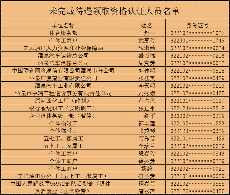 广大离退休人员:为有效防范和化解养老保险待遇欺诈冒领风险,维护社保基金安全,根据省社保中心《关于进一步优化领取社会保险待遇资格认证方式的通知》(甘社保发〔2021〕103号)文件要求,自2022年1月1日起,养老保险待遇领取人员180天内至少需完成一次待遇领取资格认证。现通过“甘肃省人社生物识别身份认证系统”认证数据比对,截至2022年8月5日,酒泉市本级还有22人未完成养老保险待遇资格认证(名单附后)。为保证广大离退休人员按时领取养老保险待遇,请未完成待遇资格认证的22名退休人员尽快完成认证,于8月10日前还未完成认证的,酒泉市社会保险事业服务中心从8月份起对其暂停发放养老保险待遇,待完成认证后再恢复其养老保险待遇。请家人及亲朋好友们动动手指,帮助老人完成认证工作,以便及时发放待遇。