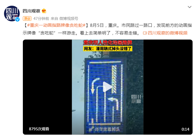 8月5日,重庆。市民路过一路口,发现前方的动画指示牌像“贪吃蛇”一样游走。看上去简单明了,不容易走错。