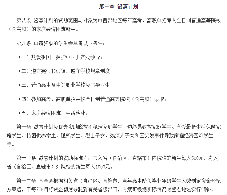 其中,滋蕙计划指使用中央专项彩票公益金资助中西部普通高校家庭经济困难新生,一次性补助其从家庭所在地到被录取院校之间的交通费和入学后短期生活费。资助标准为:考入省(自治区、直辖市)内院校的新生每人500元,考入省(自治区、直辖市)外院校的新生每人1000元。