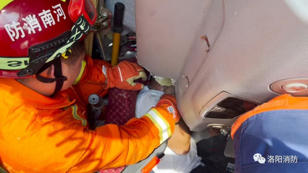 消防救援人员到达现场后发现,一辆货车侧翻在弯道的路边,货车的前窗和侧窗的玻璃散落一地,驾驶室变形严重,司机头部被卡在变形的驾驶室顶部和侧窗之间无法动弹。