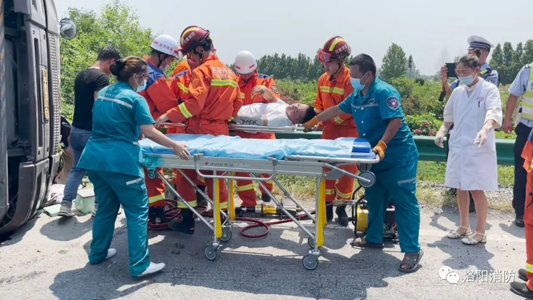 8月6日上午10时54分,洛阳市孟津区平乐镇310国道北半幅一辆货车发生侧翻,一人被困车中。接报警后,孟津区消防救援大队立即调派孟扣路消防救援站前往现场救援。