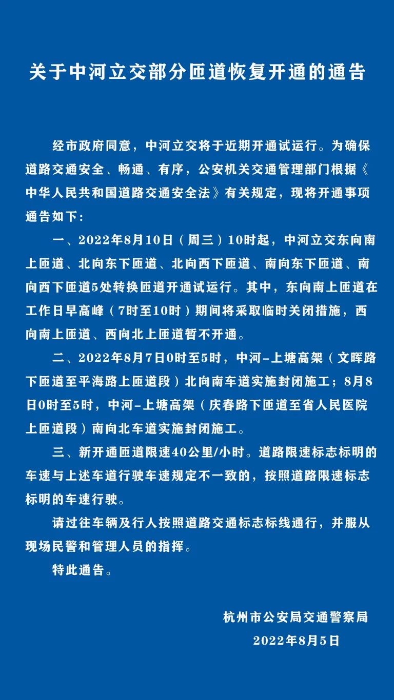 杭州市公安局交通警察局最新发布《关于中河立交部分匝道恢复开通的通告》: