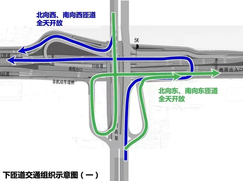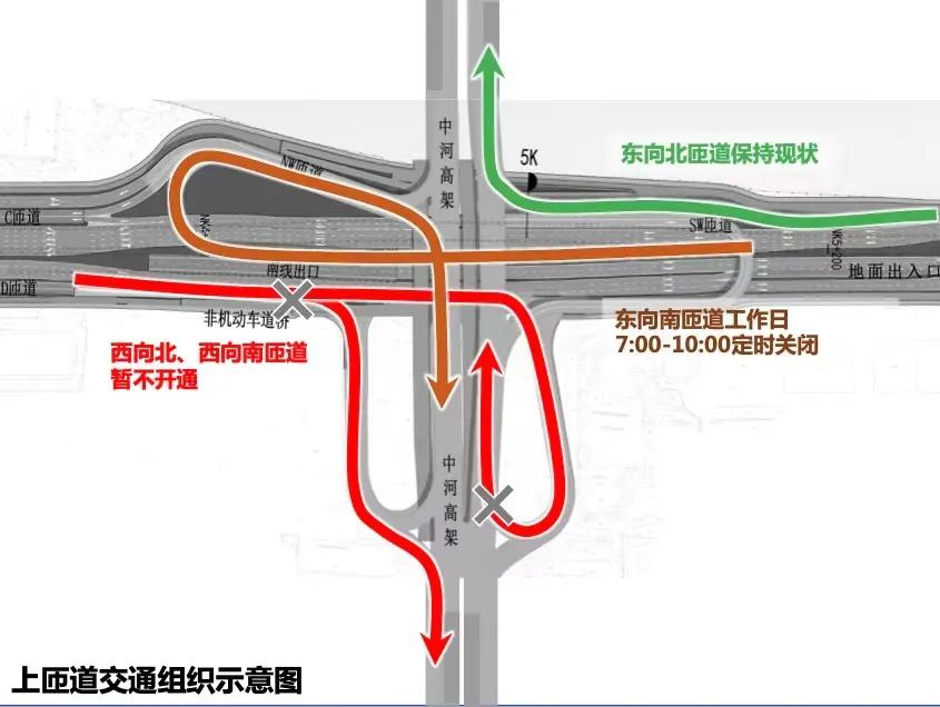 一、2022年8月10日(周三)10时起,中河立交东向南上匝道、北向东下匝道、北向西下匝道、南向东下匝道、南向西下匝道5处转换匝道开通试运行。其中,东向南上匝道在工作日早高峰(7时至10时)期间将采取临时关闭措施,西向南上匝道、西向北上匝道暂不开通。