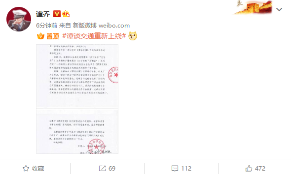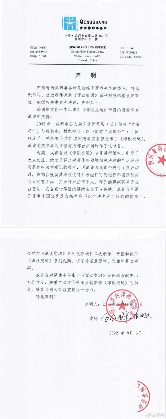 7日下午,加V认证为成都《谭谈交通》主持人的谭乔在其个人微博发出了一则律师声明,声明表示“谭乔与成都台进行了良好沟通,成都台强调其维权仅针对未经许可而进行不当获利的公司经营主体,并未针对任何个人”。