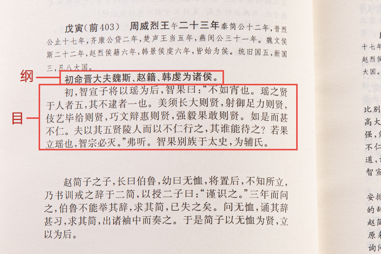 其次,体裁上首创了纲目体裁,简明扼要,是我国第一部编年纲目体史书,极大的方便我们阅读和理解。纲看梗概,目看详情,一目了然,轻松掌握历史脉络。