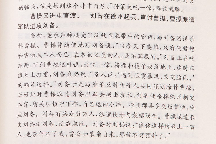 曹操曾随便地对刘备说“当今天下英雄,只有使君您和曹操我二人而已……”刘备正在吃东西,听到曹操这样说,大吃一惊,将匙和筷子跌落地上,这时正值天上打雷。刘备乘势说:“圣人说:‘遇到迅雷暴风,改变脸色。’的确是这样的。”