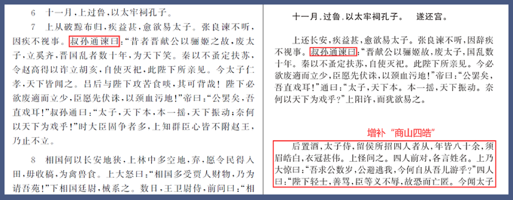 增补了一些重要史实,司马光遗漏或者刻意不载的部分:如汉高祖刘邦因商山四皓追随太子刘盈而放弃废除太子一事……