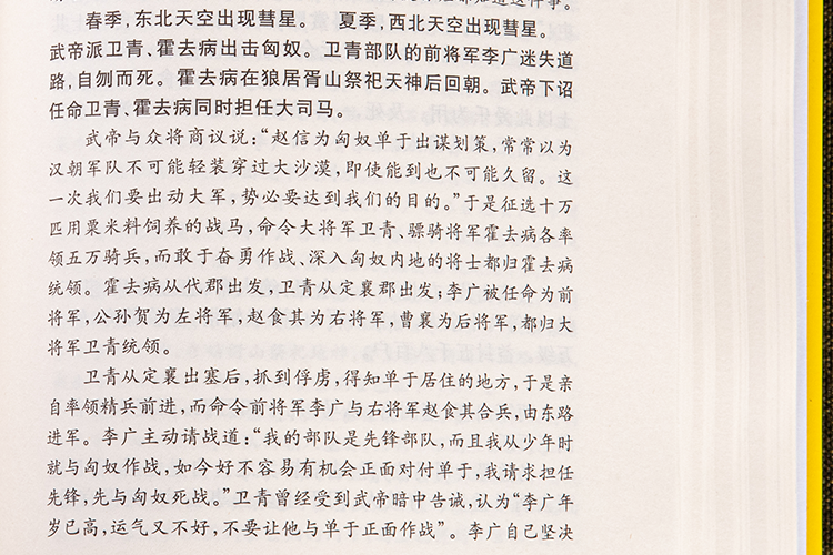 “春季,东北天空出现彗星。夏季,西北天空出现彗星。汉武帝派卫青、霍去病出击匈奴。卫青部队的前将军李广迷失,自刎而死。霍去病在狼居胥山祭祀天神后回朝,武帝下诏任命卫青,霍去病同时担任大司马。”
