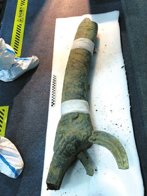 8号坑负责人、北大考古文博学院副教授赵昊介绍,这件猪鼻龙形器长1.2米,高38厘米,头宽(双眼之间)20厘米,身宽12厘米,整体是四分范对称的形式,头部、身部都各有范缝。整件器物呈长柱状,龙头上有一个宽宽的鼻子、一只长耳朵,正中一只独角,身部均匀分布着鳞片纹样及一连串羽毛状的图案,形态奇特而优雅。