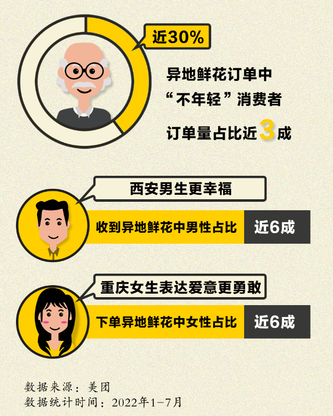 今年异地鲜花订单增长显著,同比增长76%。其中,异地下单送花最多的城市是成都、北京、深圳,而收到鲜花最多的城市是北京、上海、深圳。异地鲜花订单中,有近30%的订单来自并不年轻的80后、70后甚至60后消费者。其中80后异地鲜花订单增速最快,从订单备注看,以分居两地的夫妻群体为主。
