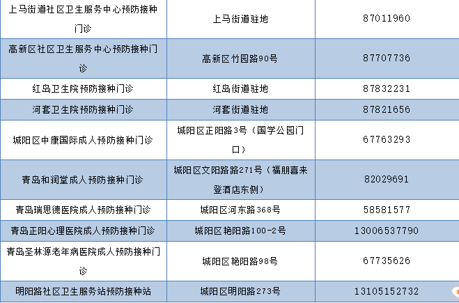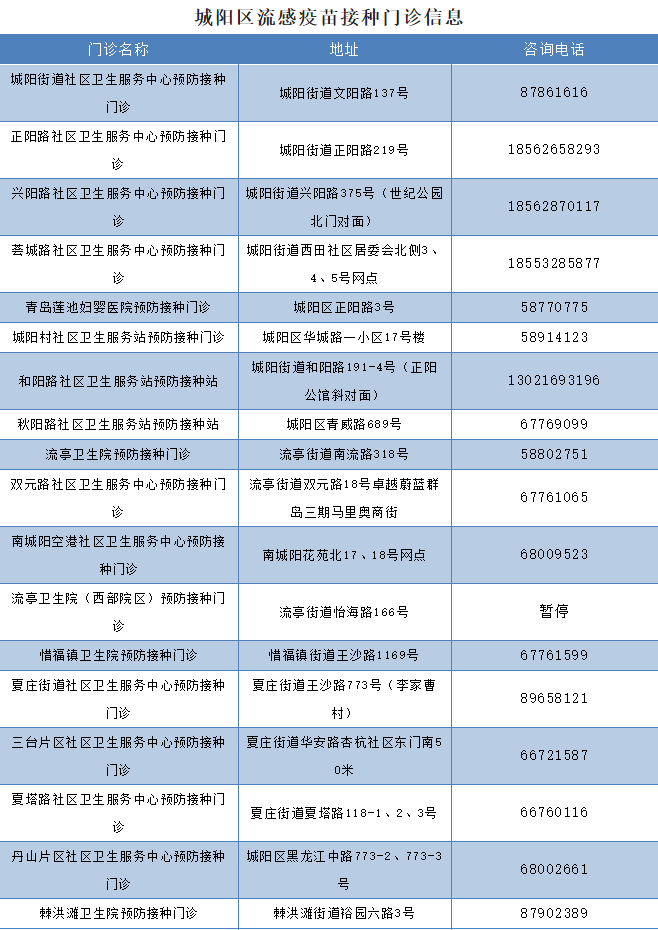 以下是城阳区各个流感疫苗接种门诊地址和联系方式,可联系相应流感疫苗接种门诊提前咨询、预约接种。