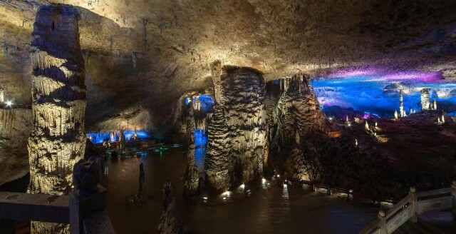 溶洞越大,越显示出大自然鬼斧神工的伟力。地面上的张家界,以奇山异水闻名世界。而地底下的九天洞,作为“亚洲第一大溶洞”,容纳了另一个山川湖海,玉池、龙井、暗河、自生桥、洞中山、小湖泊、田块、天窗、瀑布等景点,错落有致、千姿百态、色彩斑斓。