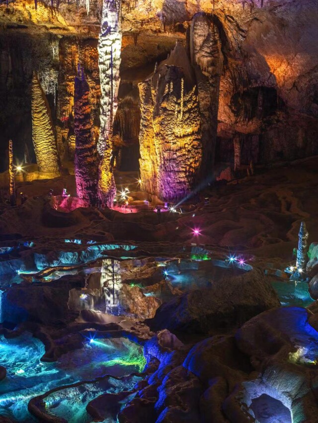 其中最魁梧的那根石柱,高12米、围径21.5米,棱角分明,直指洞顶,经世界纪录认证机构(WRCA)审核,是目前全世界发现的最大单体溶洞石柱。要知道,石柱大约一万年长高一米,这样挺拔雄伟的身姿,得需多少年才能修炼出来?