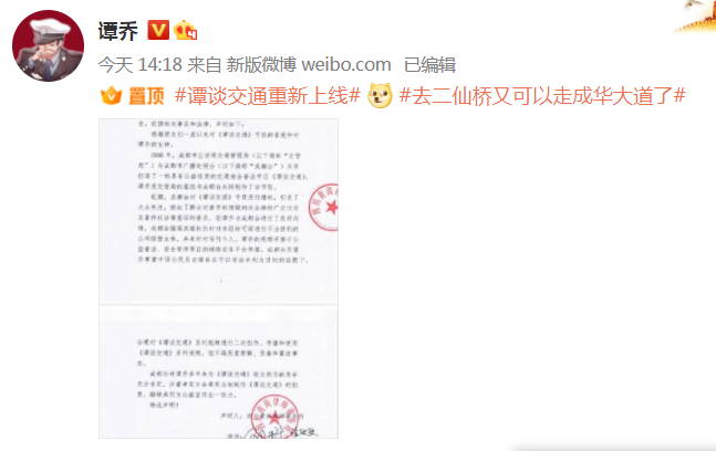 近期,成都台对《谭谈交通》节目进行维权,引发了大众关注,掀起了群众对著作权领域相关法律的广泛讨论及著作权法律意识的普及,现谭乔与成都台进行了良好沟通,成都台强调其维权仅针对未经许可而进行不当获利的公司经营主体,并未针对任何个人。
