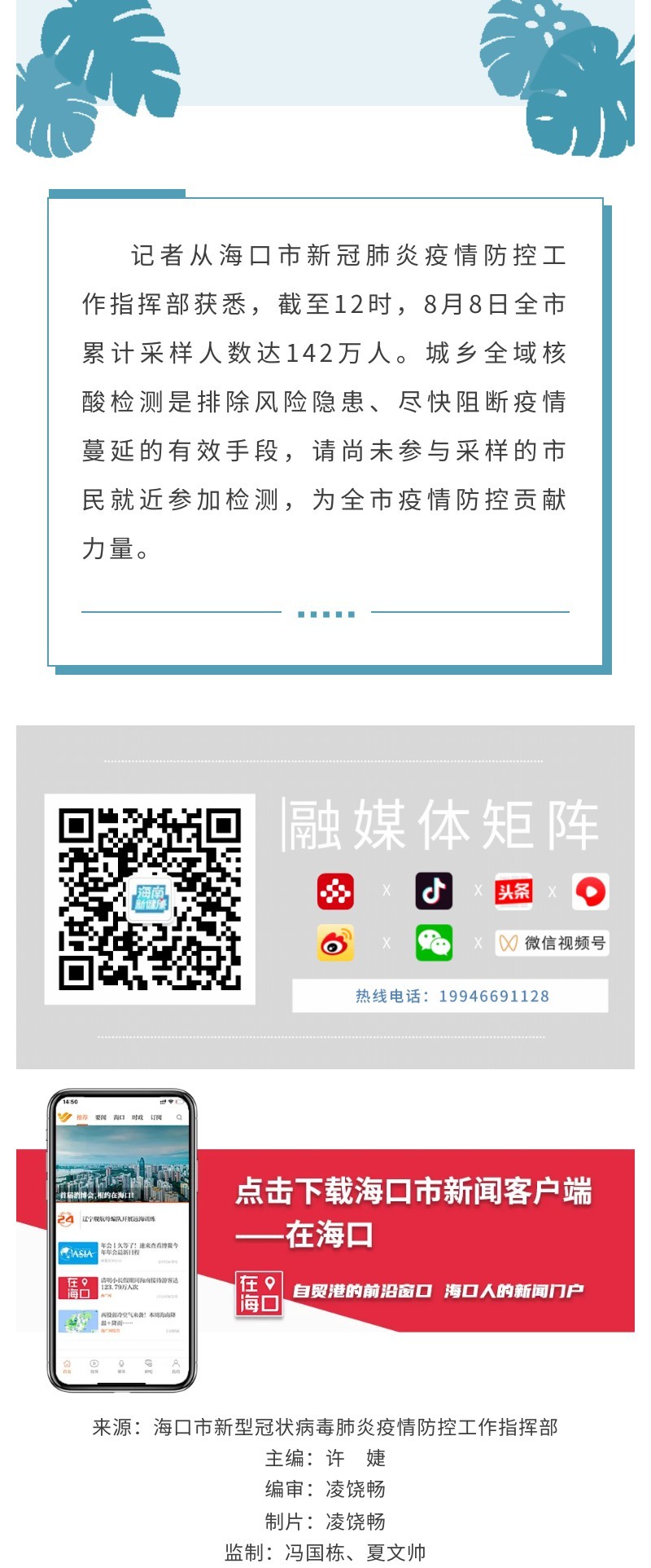 【快讯】截至12时,海口8月8日四个区城乡全域核酸检测采样人数达142万人