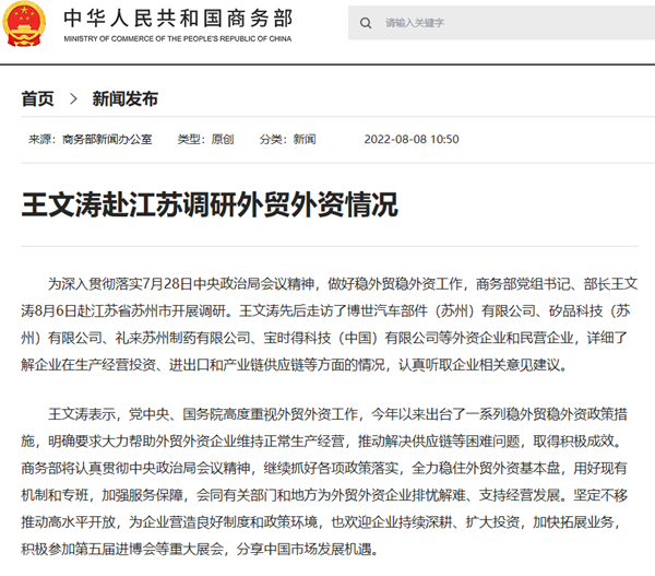 中国网财经8月8日讯 据商务部网站消息,为深入贯彻落实7月28日中央政治局会议精神,做好稳外贸稳外资工作,商务部党组书记、部长王文涛8月6日赴江苏省苏州市开展调研。王文涛先后走访了博世汽车部件(苏州)有限公司、矽品科技(苏州)有限公司、礼来苏州制药有限公司、宝时得科技(中国)有限公司等外资企业和民营企业,详细了解企业在生产经营投资、进出口和产业链供应链等方面的情况,认真听取企业相关意见建议。