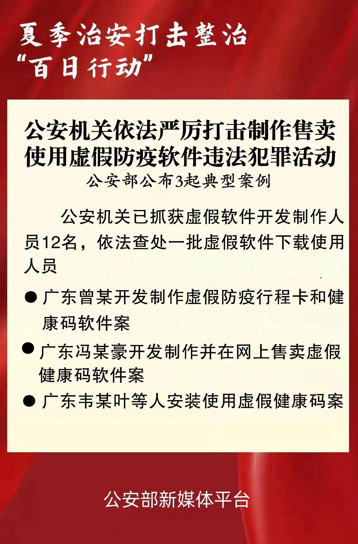 针对近期网上涉疫违法犯罪活动情况,公安部网安局高度重视,部署广东等地公安机关依法深入开展侦查,发现个别违法犯罪嫌疑人在互联网上开发制作、发布售卖虚假防疫“大数据行程卡”和“健康码”等软件,帮助他人伪造涉疫证明信息,并在山寨仿冒的健康码页面进行显示,以此蒙骗防疫工作人员查验,严重干扰疫情防控秩序。目前,公安机关已抓获虚假软件开发制作人员12名,依法查处一批虚假软件下载使用人员。