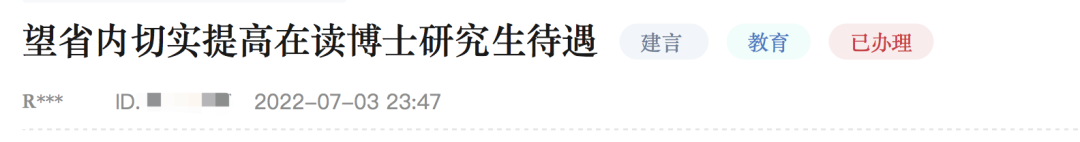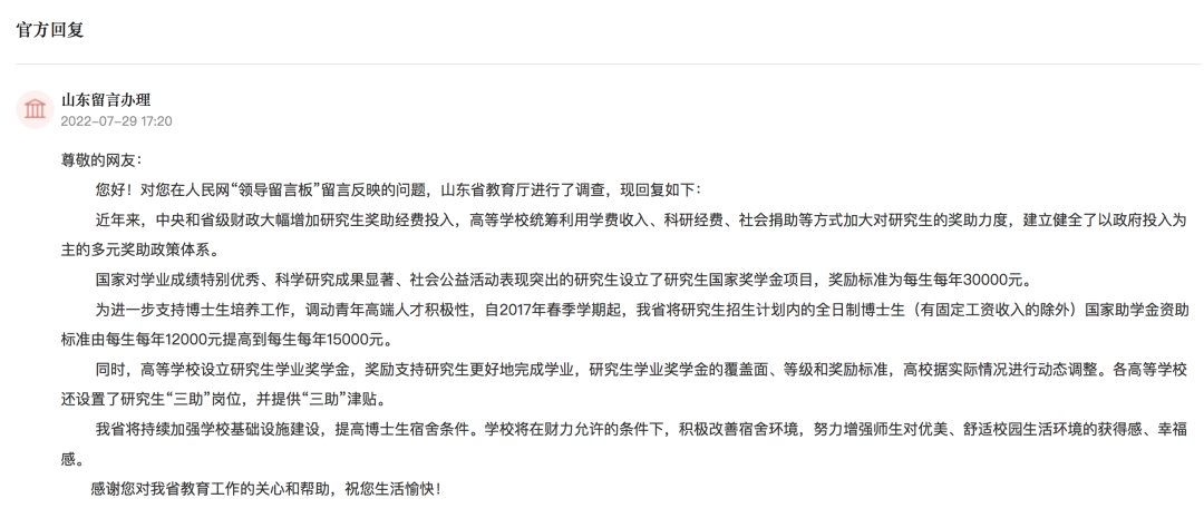 今年7月,有网友在人民网领导留言板上向山东领导留言称“望省内切实提高在读博士研究生待遇”。