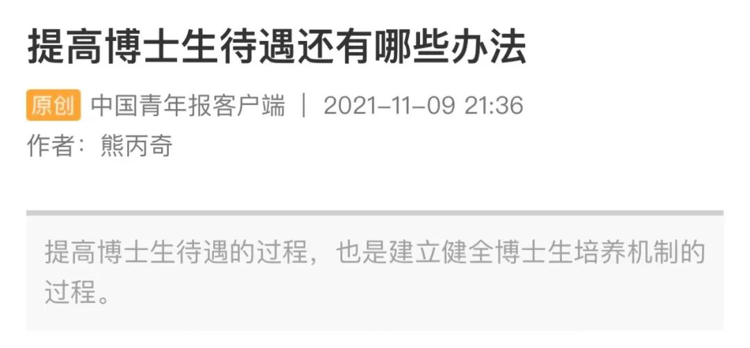 2021年11月,中国青年报刊文称,精准提高博士生待遇,是指在向博士生发放助学金基础上,通过健全导师资助制,以及博士助教制度,有针对性地提高博士生的待遇,把提高待遇与培养相结合。