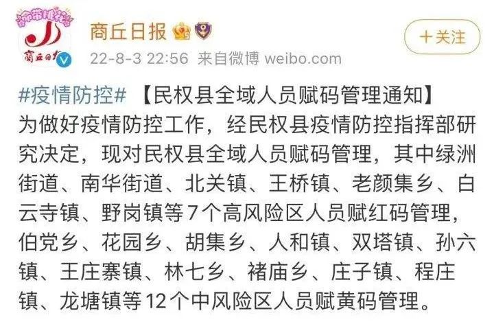 8月3日晚间,河南省商丘市民权县发出“全域人员赋码管理通知”,决定对全域人员赋码管理,其中绿洲街道、南华街道、北关镇、王桥镇、老颜集乡、白云寺镇、野岗镇等7个高风险区人员赋红码管理,伯党乡、花园乡、胡集乡、人和镇、双塔镇、孙六镇、王庄寨镇、林七乡、褚庙乡、庄子镇、程庄镇、龙塘镇等12个中风险区人员赋黄码管理。
