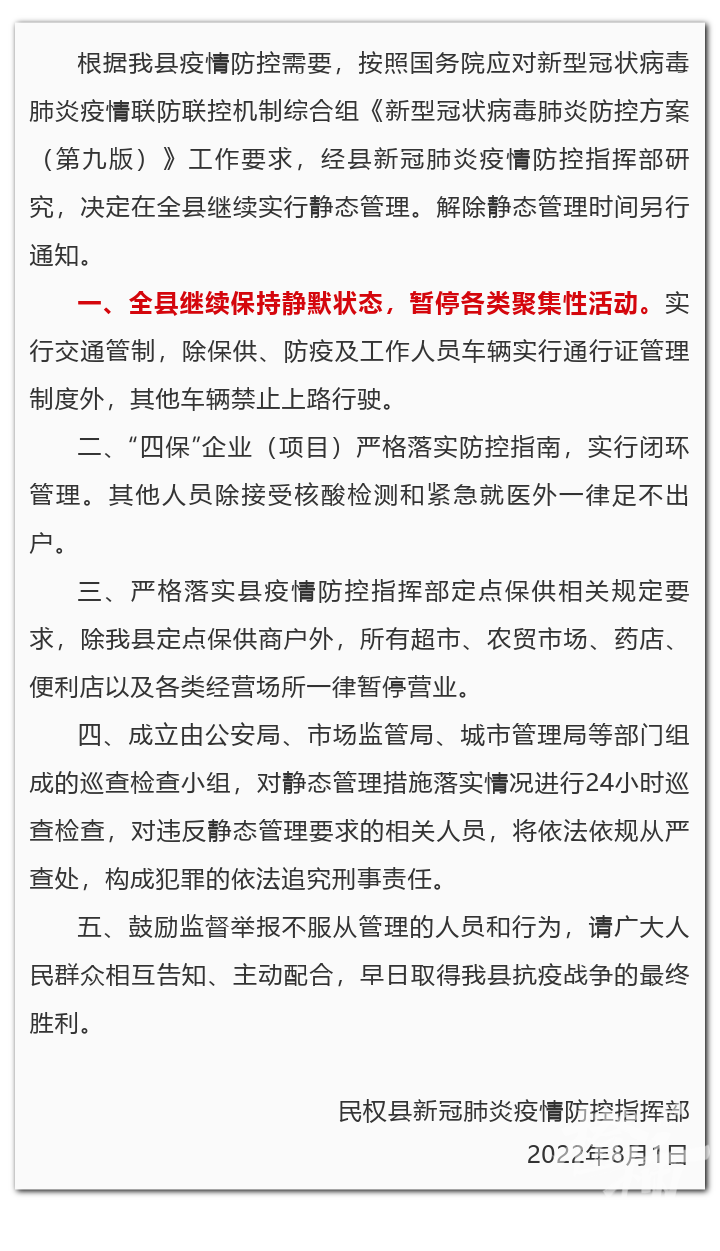 7月25日,民权县发现2例初筛阳性人员,当天发布通告,自7月25日16时一8月1日16时全县实行7天静态管理。暂停各类聚集性活动;全县实行临时交通管制,除保供、防疫等车辆外,其它车辆禁止上路行驶。全县机关事业单位除承担疫情防控任务和维护城市基本运行的人员外,一律居家办公,或在所在社区(村)转为志愿者,全面参与核酸检测和社区服务工作。