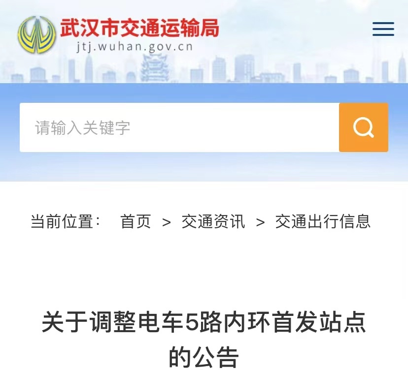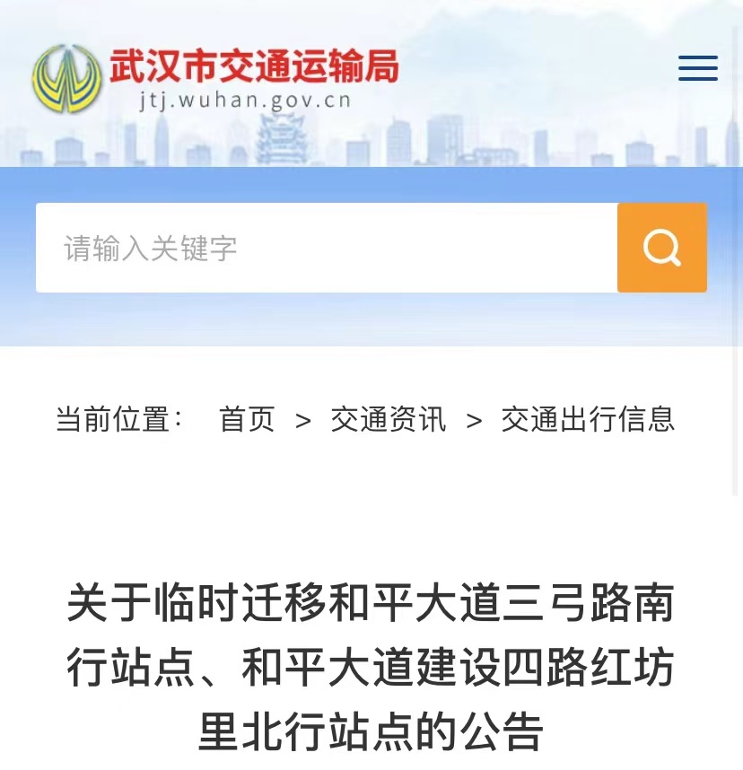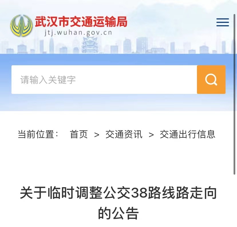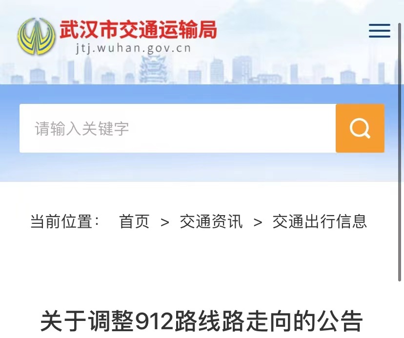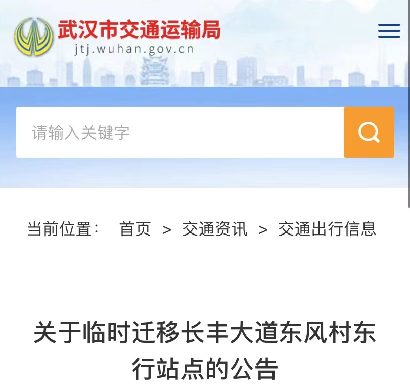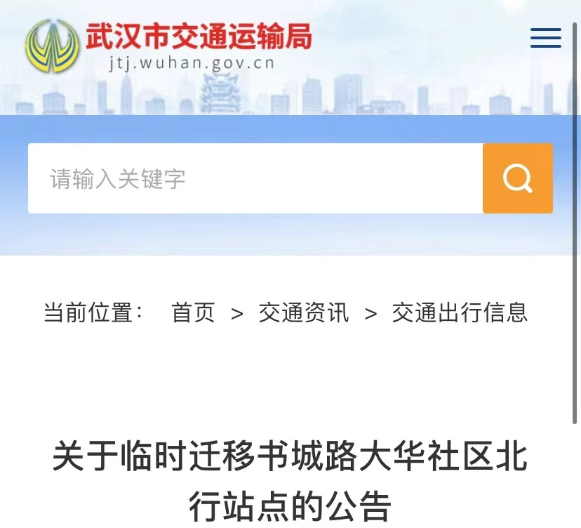 8月8日,武汉市交通运输局官网发布多条公告,涉及多个公交站点临时迁徙、多条公交线路走向调整,市民出行请注意。