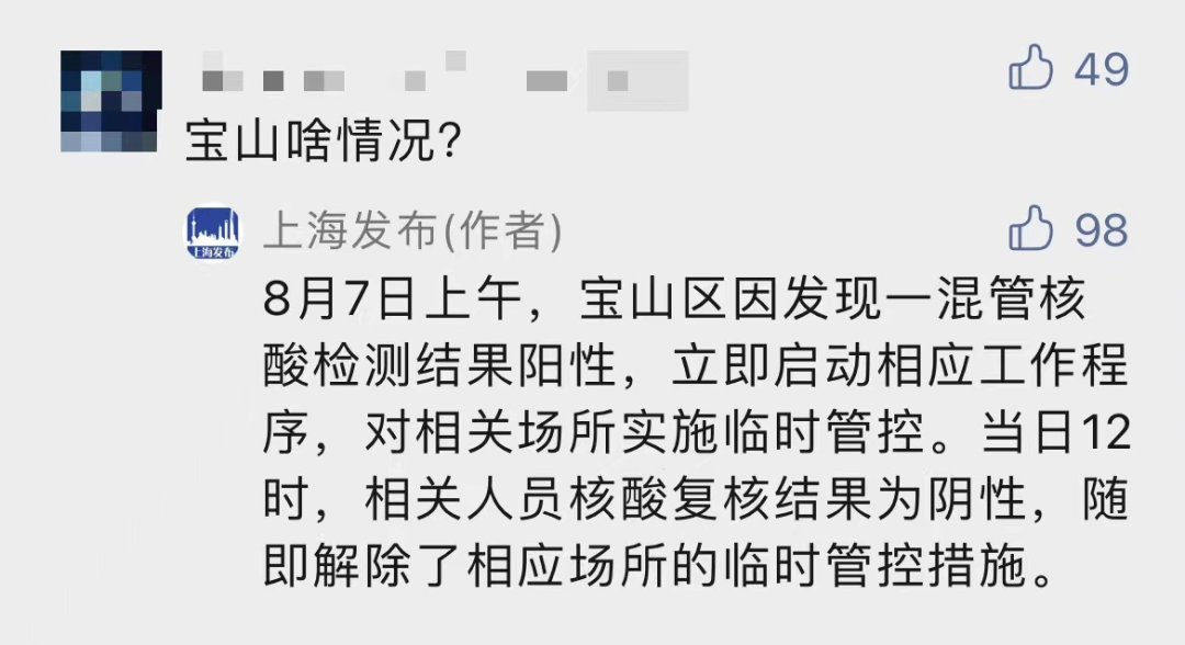 8月7日上午,宝山区因发现一混管核酸检测结果阳性,立即启动相应工作程序,对相关场所实施临时管控。当日12时,相关人员核酸复核结果为阴性,随即解除了相应场所的临时管控措施。