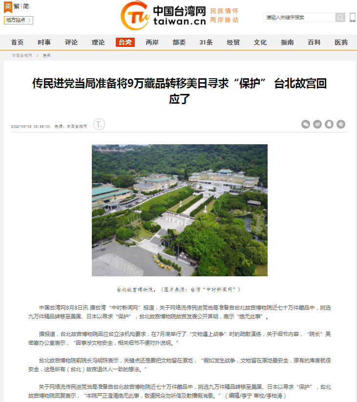 关于网络流传民进党当局准备自台北故宫博物院近七十万件藏品中,挑选九万件精品转移至美国、日本以寻求“保护”,台北故宫博物院回复表示,“本院严正澄清绝无此事,敬请民众勿听信及散播假消息”。