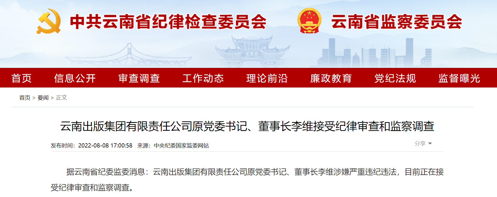 据云南省纪委监委消息,云南出版集团有限责任公司原党委书记、董事长李维涉嫌严重违纪违法,目前正在接受纪律审查和监察调查。
