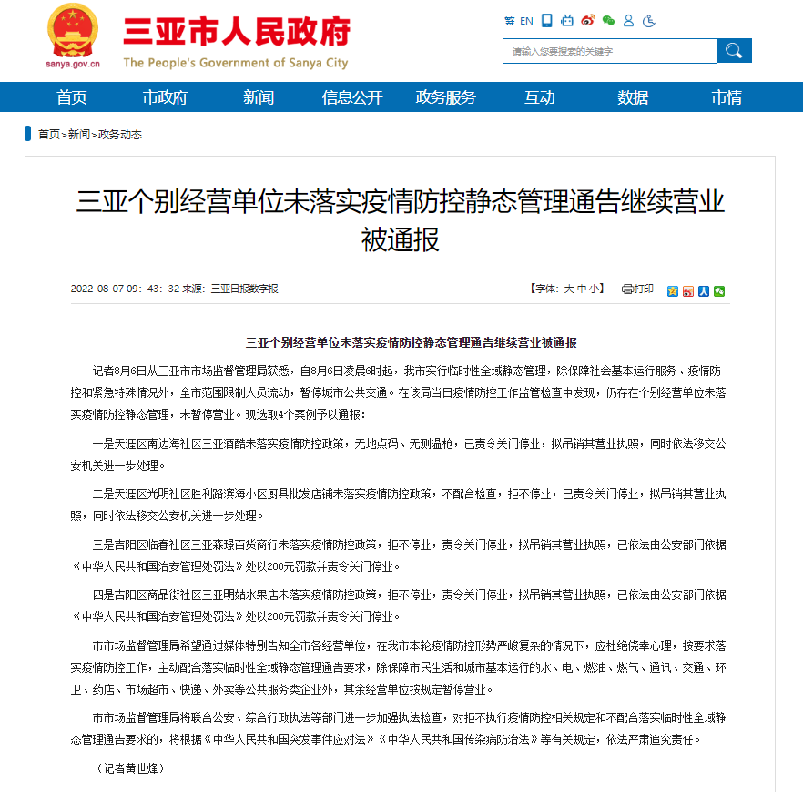 记者8月6日从三亚市市场监督管理局获悉,自8月6日凌晨6时起,三亚市实行临时性全域静态管理,除保障社会基本运行服务、疫情防控和紧急特殊情况外,全市范围限制人员流动,暂停城市公共交通。在该局当日疫情防控工作监管检查中发现,仍存在个别经营单位未落实疫情防控静态管理,未暂停营业。现选取4个案例予以通报: