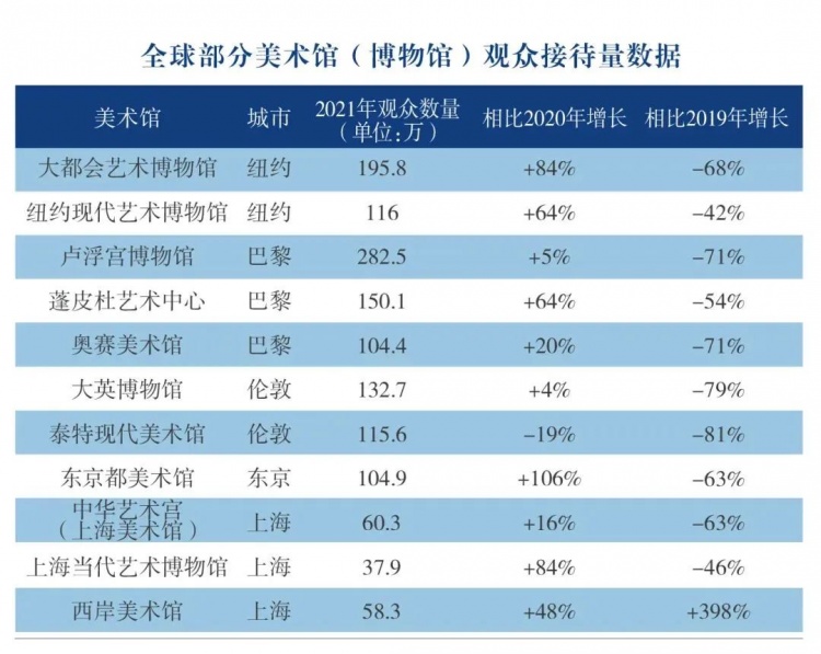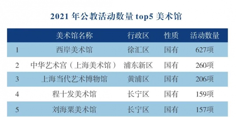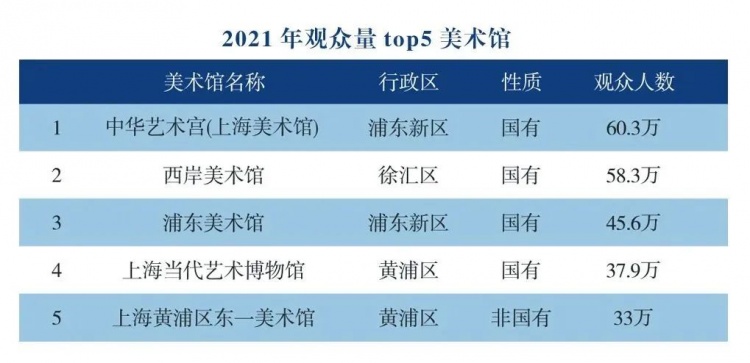 2021年全年上海的美术馆接待观众621万人次,同比增长53%。观众人次排名前五的美术馆分别是:中华艺术宫(上海美术馆)60.3万人次、西岸美术馆58.3万人次、浦东美术馆45.6万人次、上海当代艺术博物馆37.9万人次、上海黄浦区东一美术馆33万人次。值得注意的是,浦东美术馆是去年7年开馆的美术馆,开馆不到半年时间,观众人次就达到全市第三。