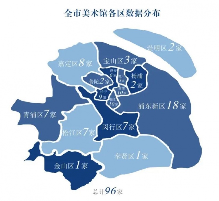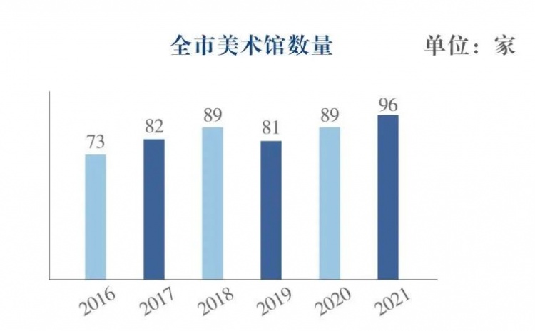 2021年上海美术馆数量再创历史新高,稳居全国城市首位,并实现16个区全覆盖。96家中,国有美术馆25家、非国有美术馆71家,与2020年相比,净增加7家美术馆。全市66家美术馆向公众免费开放,约占总数的68.8%,另有10家美术馆基本陈列免费、特展收费,占比10.4%。