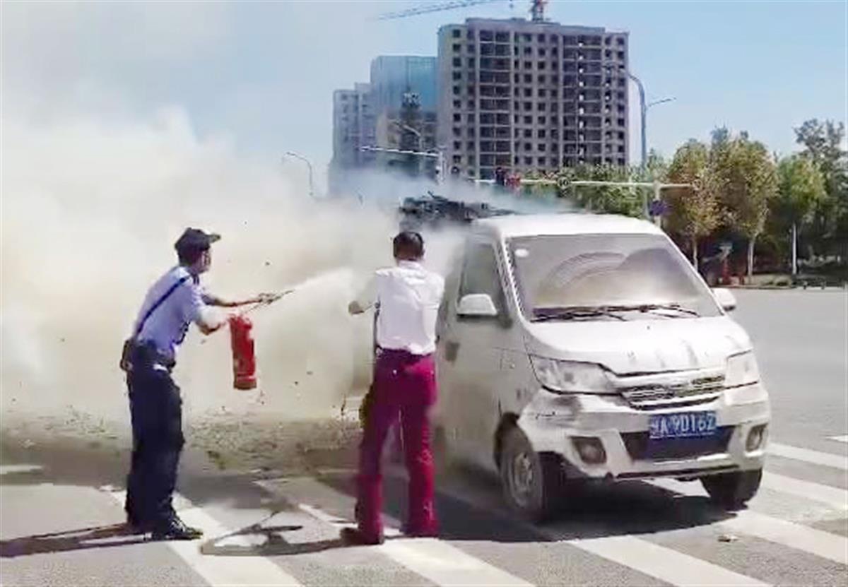 正在该站D出口附近的值班站长刘钢龙和站务人员周文博见状,立即提着站内最近的灭火器,最先冲到失火的小货车旁一阵猛喷。