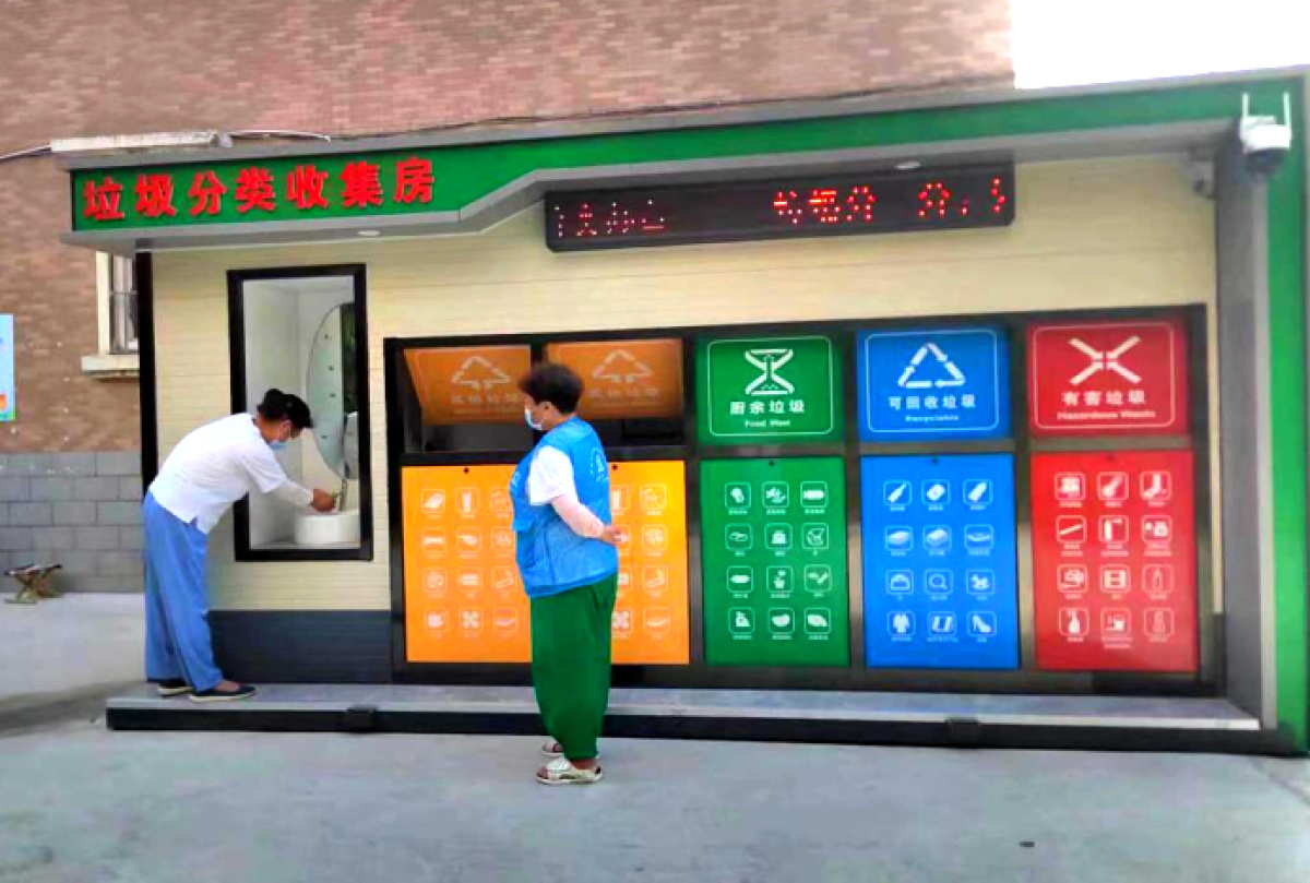 分类收集房造型美观,正面顶部电子屏展示着垃圾分类宣传标语,收集房正中间是5个自动感应的4色垃圾桶投放窗口,一侧安装了洗手池和仪容镜,方便居民在扔完垃圾后及时清洁手部,从源头上消灭细菌。收集房配有专职督导员,房内水电齐全,可清洗作业工具、存放空桶和可回收物等,安装有排风和消杀设施,具备“消杀、除臭、清洗、破袋”等主要功能,极大程度地减少了异味和细菌的滋生。收集房的厨余垃圾、其他垃圾日产日清,可回收物、有害垃圾做到及时清运。